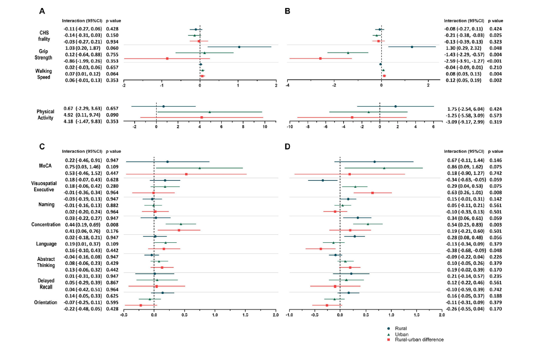The findings demonstrated clear rural–urban differences in intervention outcomes across cognitive and physical domains. At 12 months, urban participants demonstrated significantly greater improvements in visuospatial/executive function and walking speed, alongside more pronounced reductions in frailty. In contrast, rural participants showed greater gains in handgrip strength and language function, while frailty reduction remained minimal in this population.