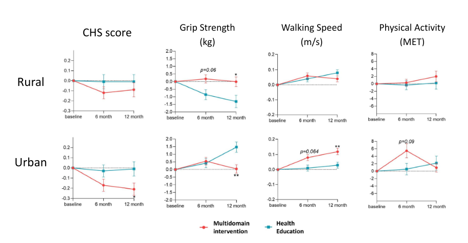These rural–urban differences in intervention outcomes may be attributed to disparities in baseline characteristics and contextual factors, including lower average years of education among rural participants (4.9 years in rural areas versus 8.4 years in urban areas), weaker baseline physical and cognitive performance, and reduced access to healthcare and preventive health resources in rural settings.